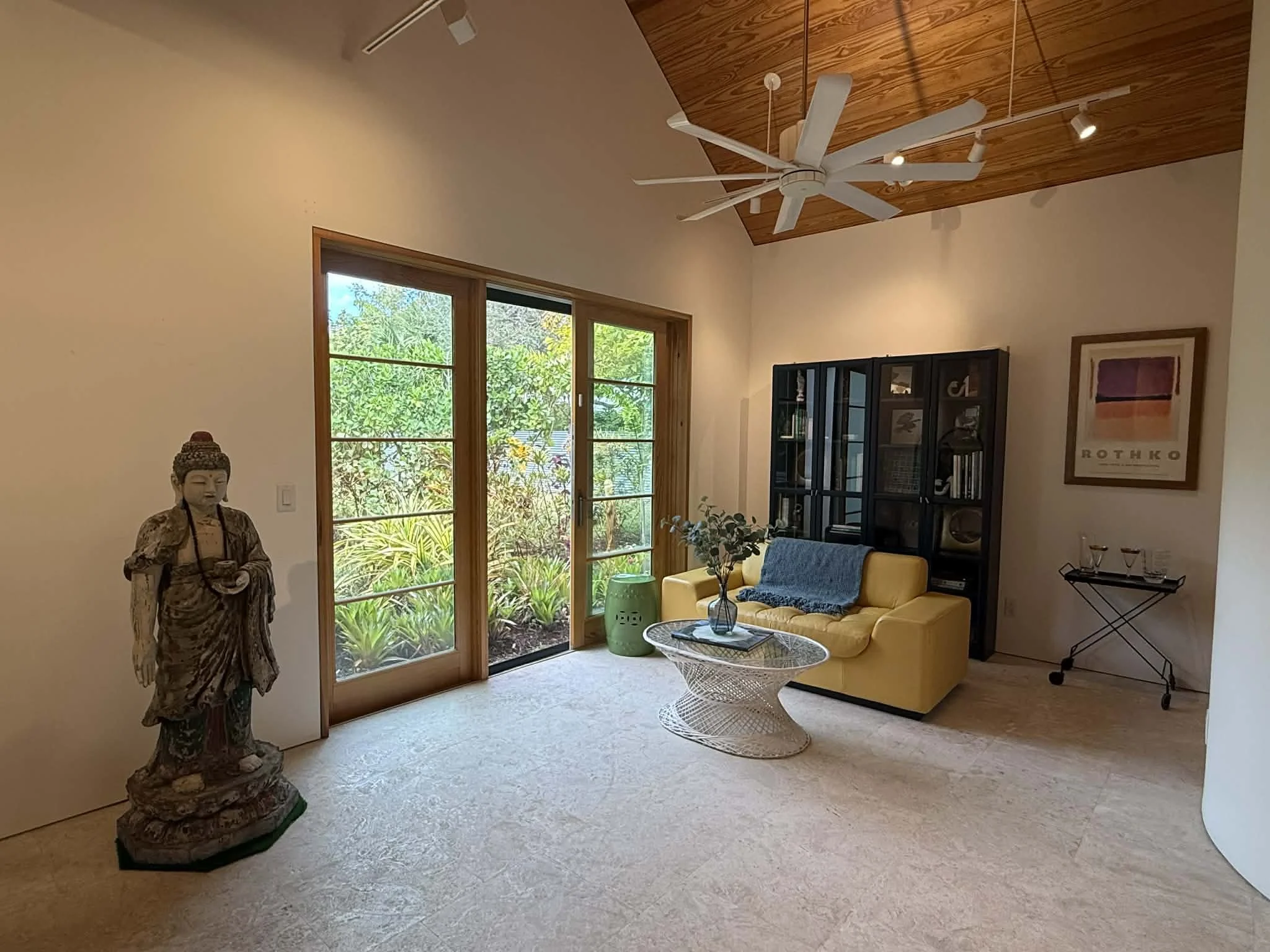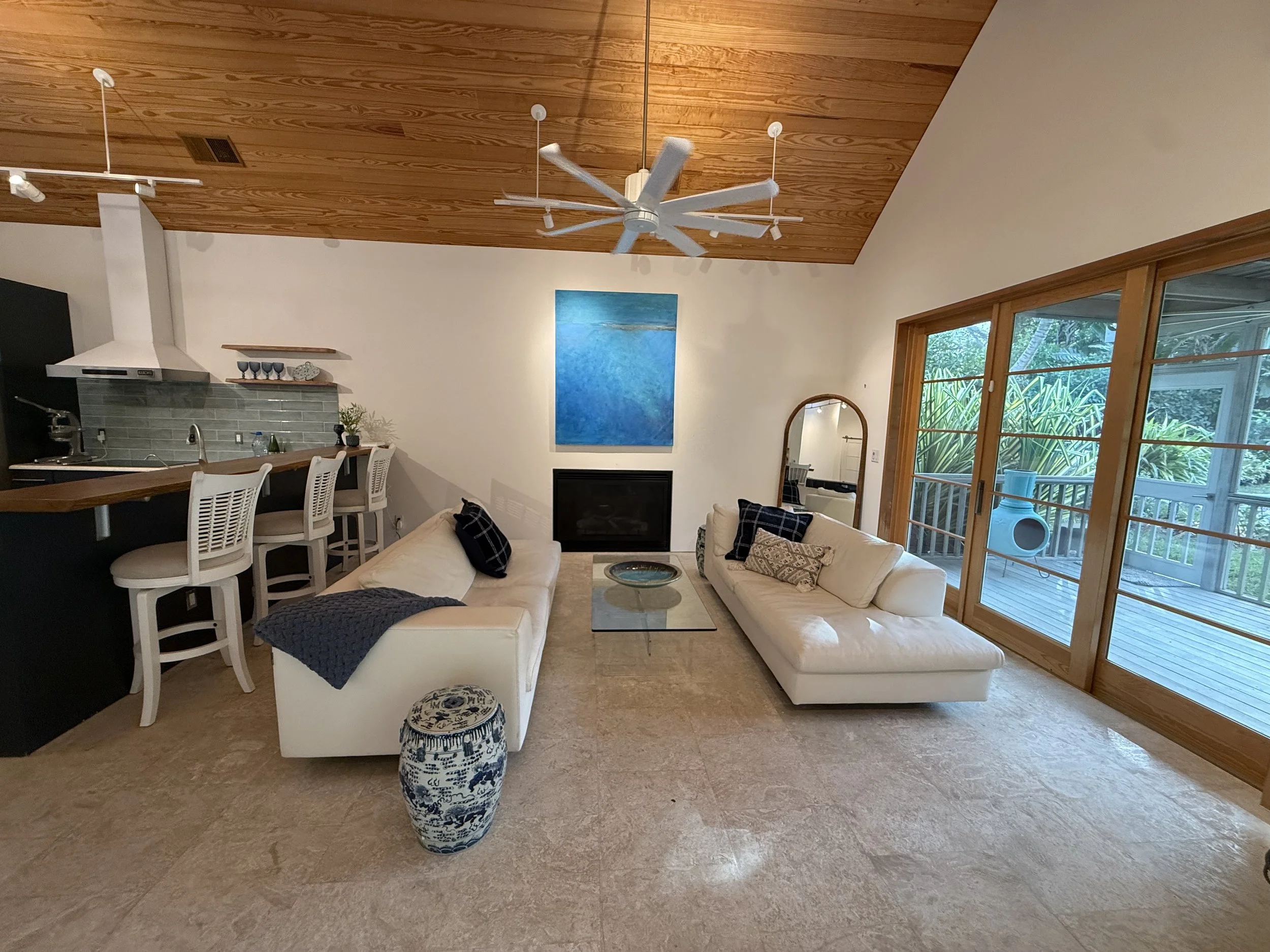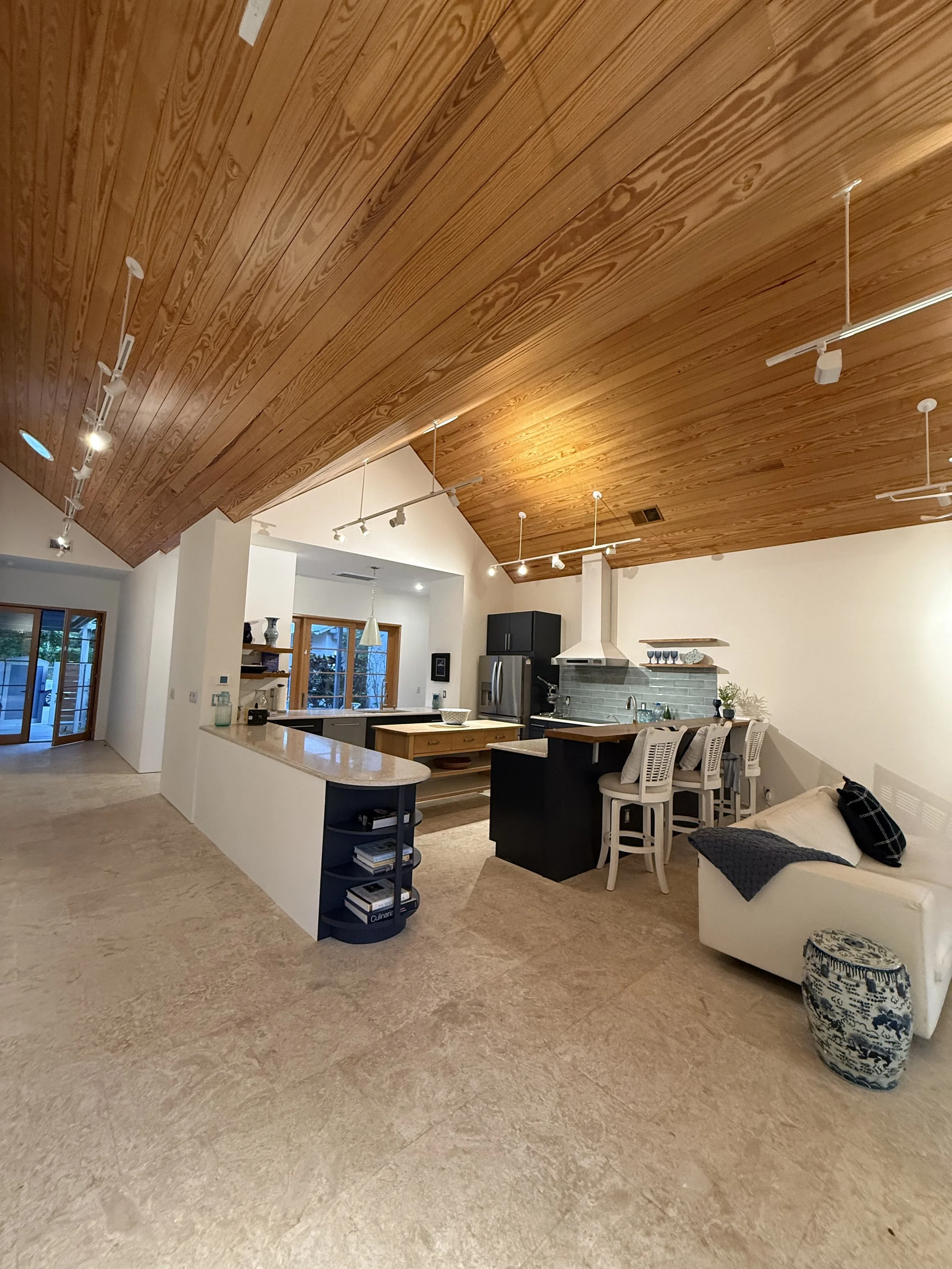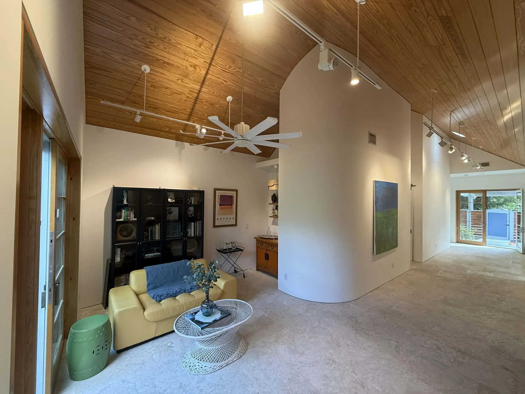Soaring pine wood ceilings throughout the proprty and large scale wall spaces with curated gallery lighting.
